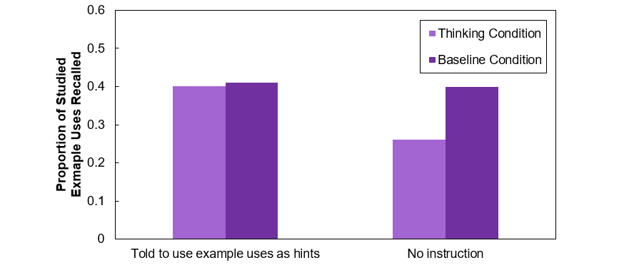 (2) Adapted results from Experiment 2A and 2B of Storm and Patel (2014). When participants were told to use example uses as hints (left columns), no recall difference was observed between the thinking and baseline conditions. However, without this instruction (right columns), participants in the thinking condition forgot some of the example uses (i.e., recalled fewer example compared to the baseline condition).