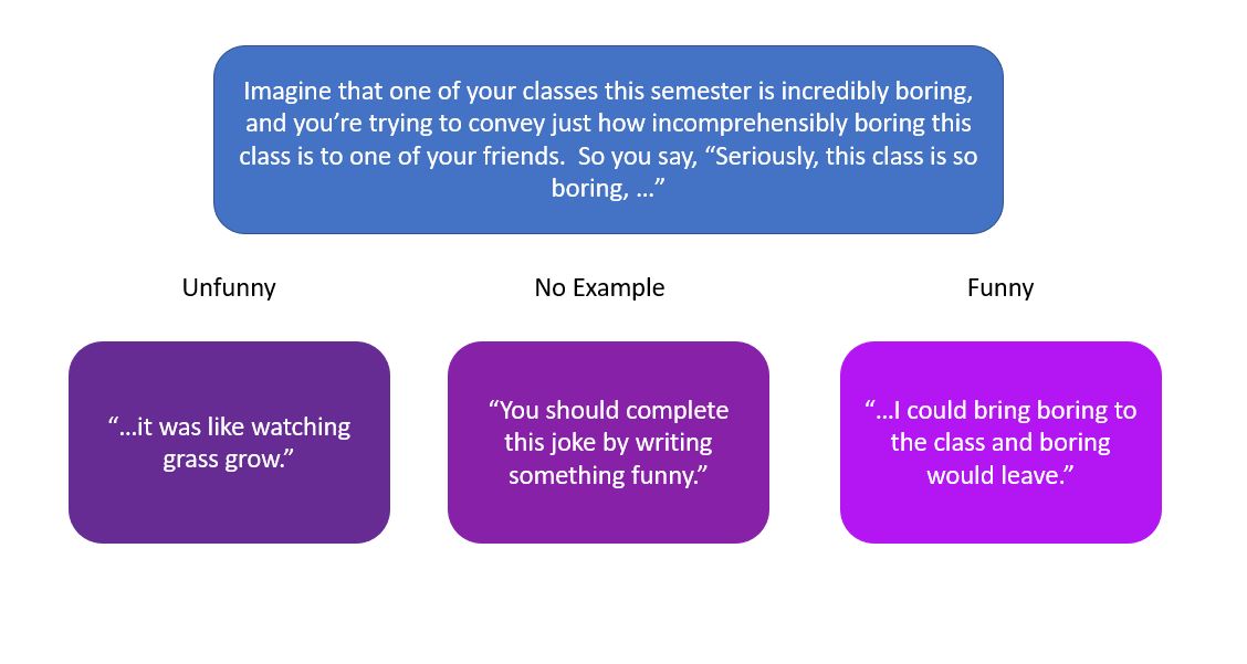 In a single experiment, all participants were asked to produce their own funny jokes in response to two open-ended prompts (e.g., “Seriously, this class is so boring…”). Participants were split into three groups, with one group seeing funny examples, one group seeing unfunny examples, and one group seeing no examples before coming up with their own jokes. All examples were taken from a previous study in which responses to the joke prompts were rated for funniness. Each participant generated one joke per prompt and were allowed as much time as they wanted to create the joke. Researchers then rated all responses for funniness and similarity to the examples, with funniness rated on a 5-point scale and similarity categorically rated as no overlap, some overlap, or a repeat of the example.