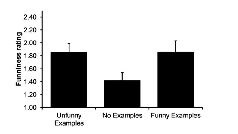 Surprisingly, participants who saw both funny and unfunny examples produced funnier jokes than participants who saw no examples. Even more interestingly, participants demonstrated little evidence of fixation (as measured by similarity ratings) on both funny and unfunny examples, with similarity ratings being very similar between both groups that saw examples. The authors argue that seeing examples—regardless of their quality—provides a starting point from which participants can branch from, which naturally increases the funniness of a joke.