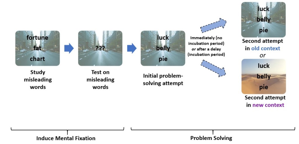 To test their idea, the researchers began by inducing mental fixation for a problem-solving task. To do this, they had participants study sets of three misleading words (e.g., fortune, fat, chart). These word sets were presented on top of a particular background context (e.g., a picture of a city street). To ensure that participants learned these words well, they were then tested on them.