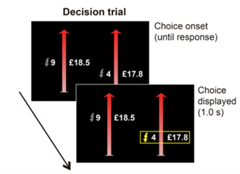 What would you choose? Here, a trial where participants decided between giving a stranger nine electric shocks for £18.5 or four electric shocks for £17.8. The second panel shows that the player chose the options with 4 shocks and 17.8 euros, the morally ‘good’ choice: fewer shocks for less money, from Yu et al. (Figure 1b).