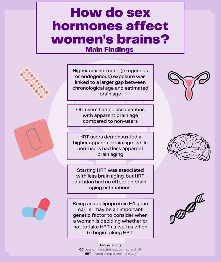 The study illustrated that increased sex hormone exposure was linked to higher apparent brain age which means that women with more cumulative hormone (endogenous and/or exogenous) exposure over the life span (indexed as age at first period, when menopause began, time since menopause, body mass index, and the duration of HRT use) had a larger gap between their chronological age and their apparent brain age.