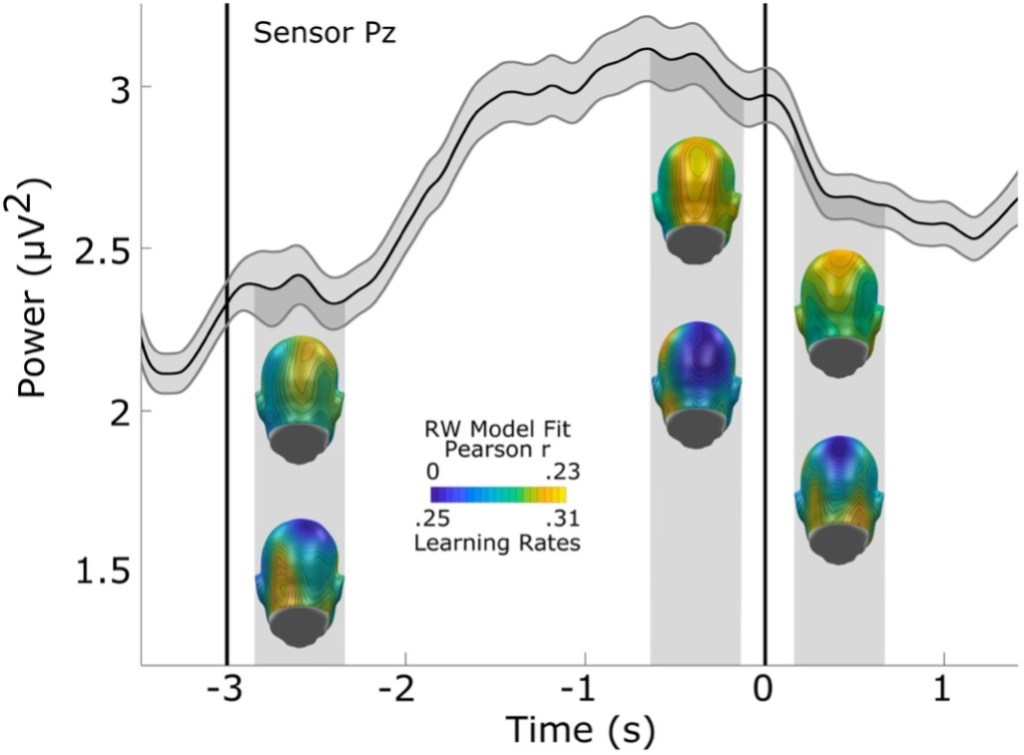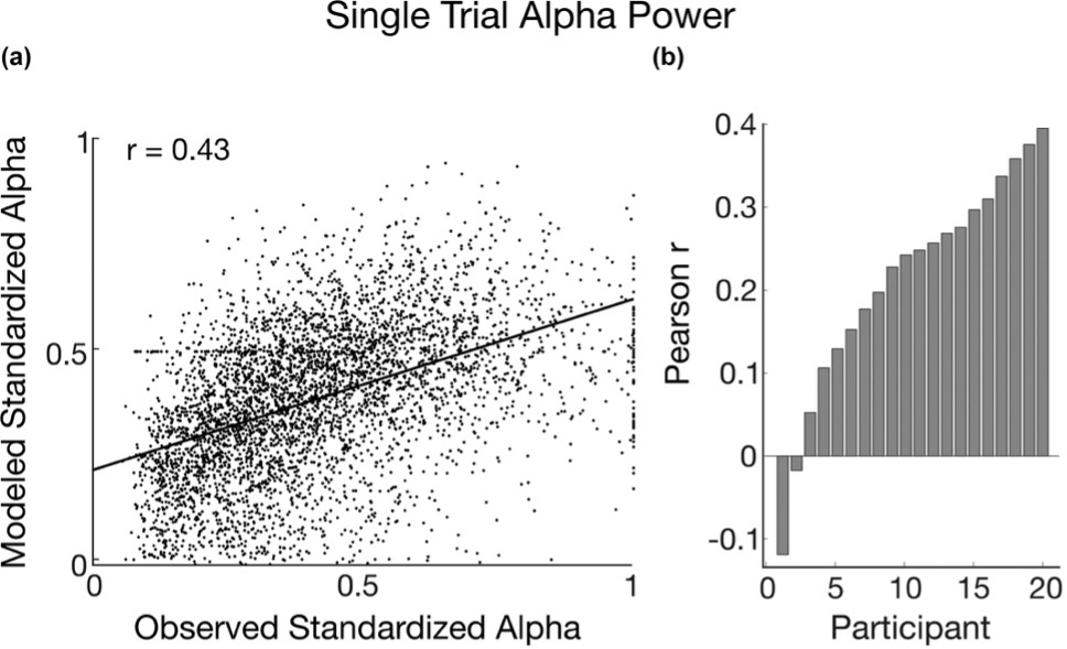 Across all possible data points, recorded alpha was positively associated with predicted associative strength. In 18 out of 20 participants, observed brain wave power changes followed the same patterns as predicted associative strength changes over time. As the predicted association between the grayscale patch and the loud noise increased, so did the alpha brain wave power. This means that as a participant learned that the visual patch predicted a loud noise, that person’s alpha waves increased in size. This relationship between alpha and learning is important because it demonstrates that these particular brain waves track or reflect this simple learning.