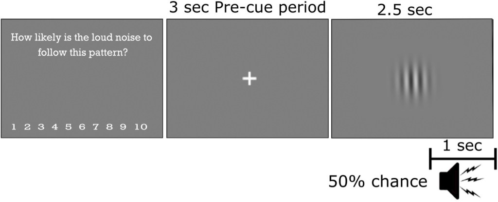 Participants stared at a white cross on a gray screen for 3 seconds, which was followed by a simple gray and white fuzzy striped circle called a Gabor patch. Unbeknownst to participants, there was a 50% chance this patch would be paired with a very loud and startling noise burst. Participants were asked to rate how likely they thought a loud noise burst would appear in the next trial. This procedure repeated for 120 trials.