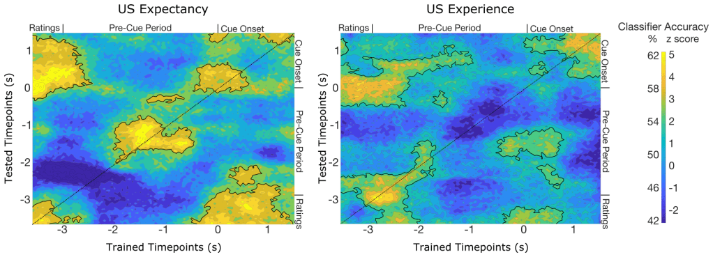In the figure below, yellow and green indicates when the classifier was able to use the brain data to distinguish the 2 trial types (i.e., trials followed by a loud noise or no loud noise). The map on the left distinguished participants’ expectancies of an upcoming loud noise – that is, if they indicated a high expectancy or a low expectancy of a loud noise. Outlined areas indicate that the classifier was able to reliably tell the 2 trial types apart from the brain data. The main times that distinguished conditions were the very beginning (when participants were actively rating), middle (while they were waiting), and end (when the grayscale circle returned) of each trial.