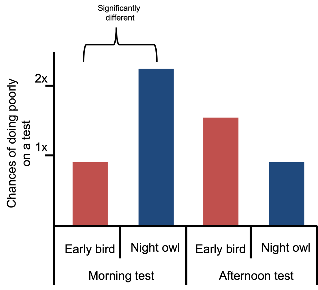 Finally, they found that students who would be considered “night owls” were over twice as likely to perform poorly on morning tests (see figure below).