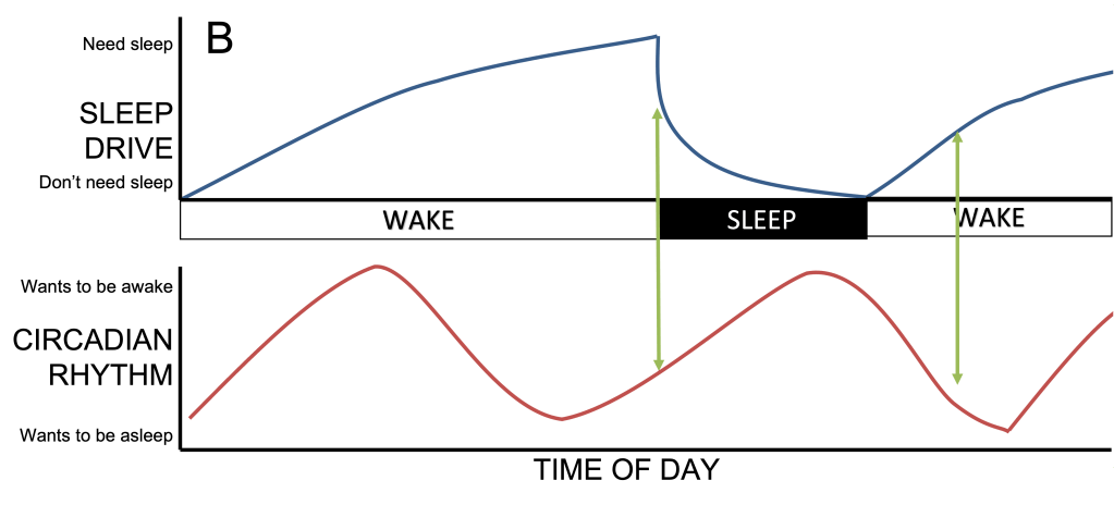 Usually, the circadian rhythm and sleep pressure are in sync, and sleep occurs when there is a low circadian drive for wakefulness and high sleep pressure (see the first figure below). However, dramatic changes to when we go to bed or wake up can confuse the brain and body. Instead of the circadian rhythm and sleep pressure working together, they can become misaligned resulting in difficulties falling or staying asleep (see the second figure below).