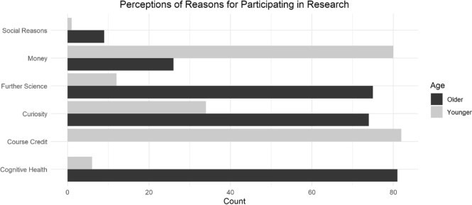 Ryan and Campbell surveyed 88 cognitive aging researchers (mostly faculty in North America). The researchers were asked why they thought younger and older adults participated in research. Respondents thought that younger adults primarily participate to obtain course credit and for monetary compensation, whereas they thought older adults participate to get a sense of their cognitive health, to further science, and out of curiosity (see figure below). And, the respondents were much more likely to report that motivation to participate in research was higher for older adults than for younger adults.