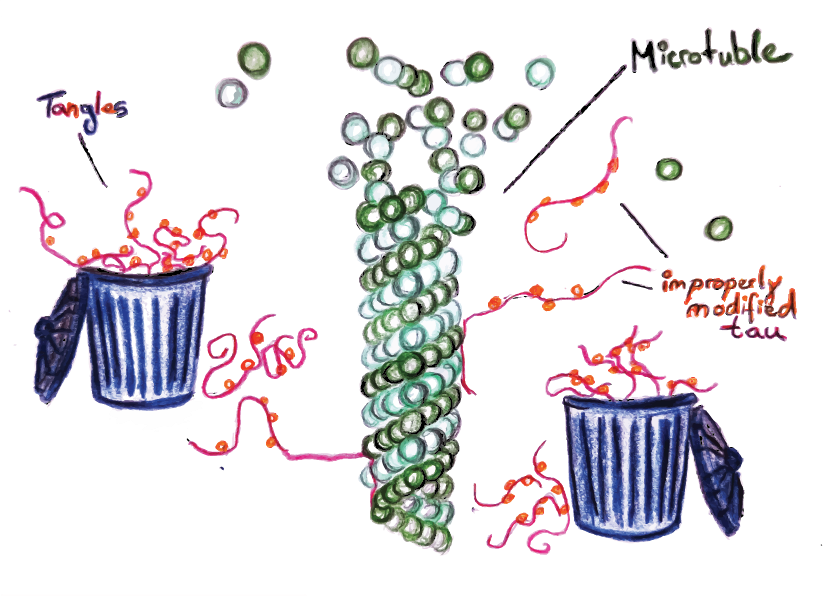 But there’s more to the story with Alzheimer’s. Improperly modified tau proteins bind to each other and form clumps or plaques typically observed in the brains of individuals with Alzheimer’s disease. These clumps, referred to as “tangles” due to their resemblance to long strands clustering together, create a build-up of difficult-to-remove waste material, placing an excessive burden on nerve cells. You can compare this process to trash building up in a city: the consequences of waste accumulation can include lung diseases, polluted rivers, and a clogged infrastructure. In the human brain, “trash” tangles and microtubule instability lead to the death of the nerve cell. If a nerve cell dies, it cannot communicate with neighboring nerve cells, so a stored memory is lost. People who experience this process many times over will forget important information like where they put their keys, where they parked their bike, and eventually, where they live.