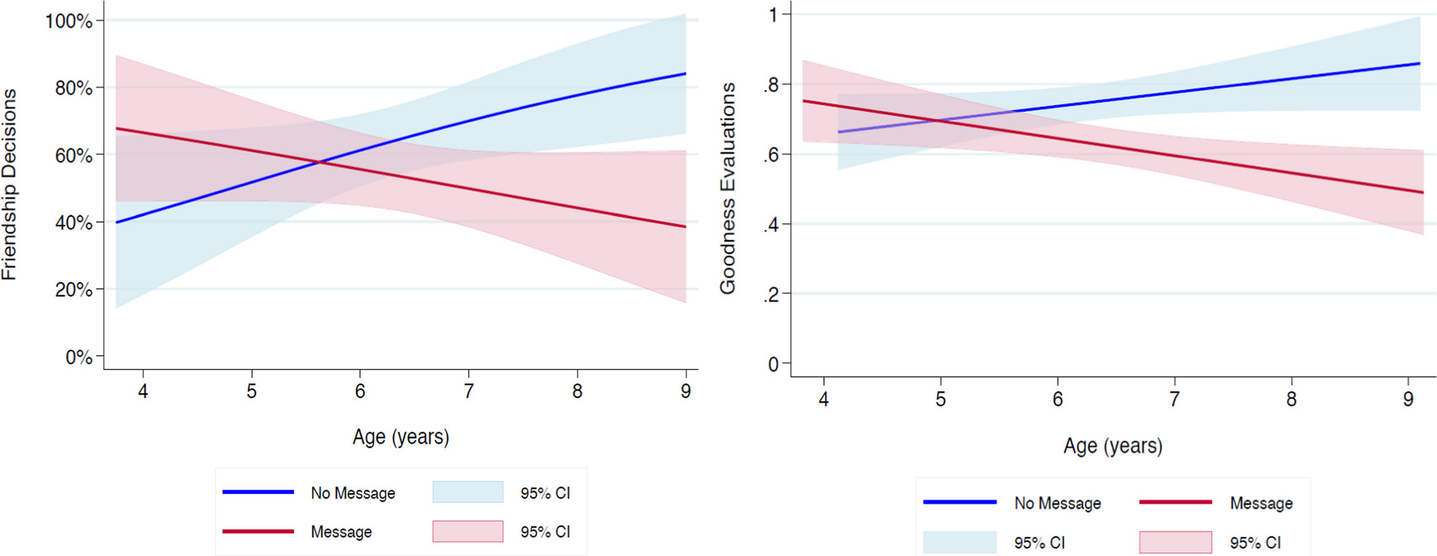 Left: “Probability of children choosing to be friends with the novel group member, by children’s age. Children overheard a video call in which the caller either made negative claims about a novel social group (red line) or did not (blue line).”