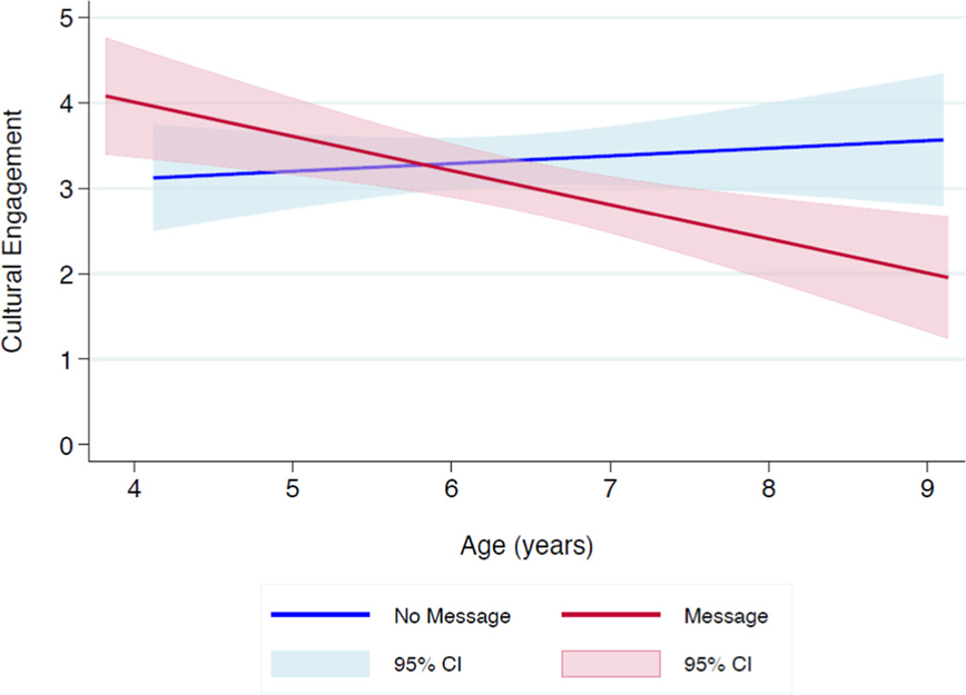 Next, the researchers also explored children’s willingness to engage with Gearoo culture. Conder and Lane didn’t stop at asking about the aspects of culture mentioned directly in the video call (their clothes and their food), but also included three other aspects of cultural identity: playing a Gearoo game, going to a Gearoo party, and learning the Gearoo alphabet. Once again, age and message group mattered. As the age of the participant increased, children’s willingness to engage in various aspects of Gearoo culture increased if they had not heard the negative messages and decreased if they had.