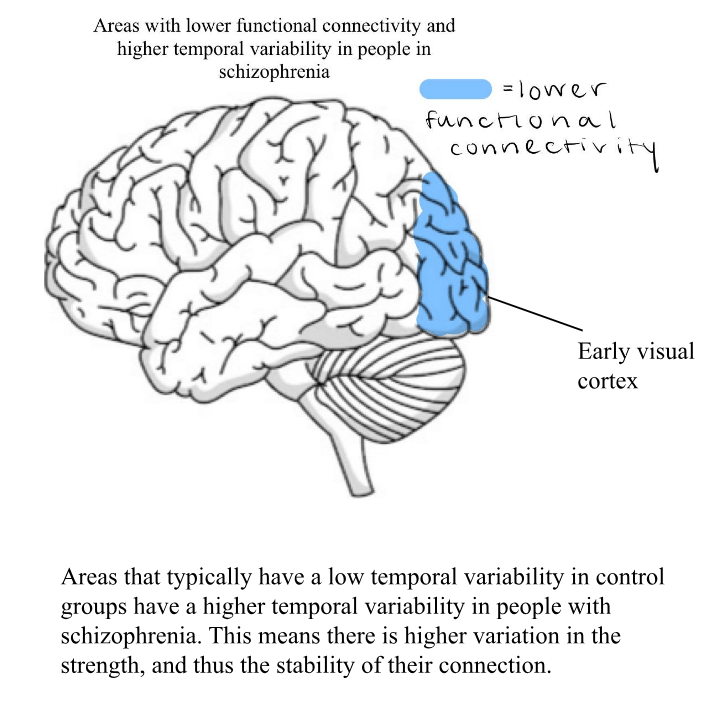 Researchers analyzed data from 123 people with schizophrenia and 136 people without it. Temporal variability of functional connectivity in early visual cortical areas, both between themselves and other brain regions (e.g., areas of the temporal lobe) was higher in people with schizophrenia than in people without schizophrenia. The higher variation in connectivity for people with schizophrenia means that the stability of the functional connection is lower.