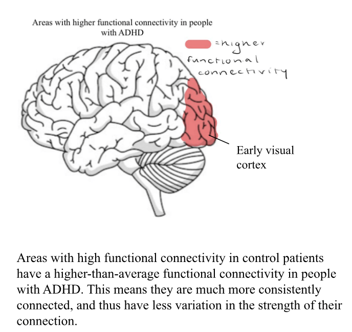 Researchers also analyzed data from 92 children with ADHD and 142 people without it. Higher-than-average functional connectivity was found in early visual cortical areas for people with ADHD compared to people without ADHD.