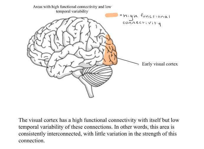 As seen in the figures below, temporal variability of functional connectivity of different brain regions is low among early visual cortices, but they have a high functional connectivity with each other. Temporal variability of functional connectivity is high in brain regions such as the amygdala and hippocampus, but they have low functional connectivity with each other. Interestingly, the brain dynamics of those with schizophrenia and ADHD showed a different pattern.