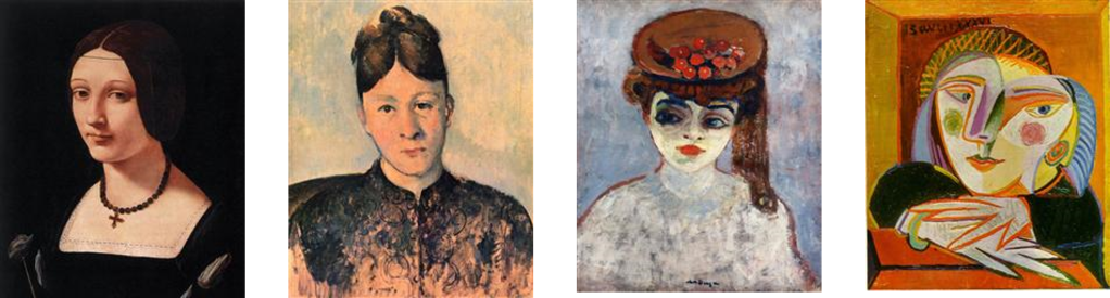 Portraits examples (left to right): Images of paintings, under public domain or fair use licensing. https://www.wikiart.org/en/giovanni-antonio-boltraffio/portrait-of-a-lady-as-st-lucy-1500, https://www.wikiart.org/en/paul-cezanne/portrait-of-madame-cezanne, https://www.wikiart.org/en/kees-van-dongen/woman-with-cherries-on-her-hat-1905, and https://www.wikiart.org/en/pablo-picasso/woman-by-the-window-1936