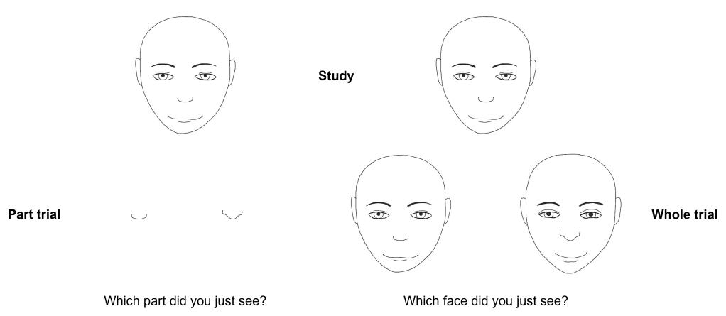 Experimentally, there are several tasks designed to explore the holistic processing of faces. One of these is the part-whole task. In this task, people first see a target face. After its presentation, people are shown either a) two faces (“whole” trial), or b) two face features (e.g., noses; “part” trial) side by side (see example trials below). The participant’s goal is to select which of the faces they had been presented before (in “whole” trials), or which of the two features belonged to the previously presented faces (in the “part” trials). If faces are processed holistically, performance should be better when features are integrated into a whole face than when presented in isolation. In line with this hypothesis, research consistently finds that people’s performance for real faces is better for whole trials than for part trials.