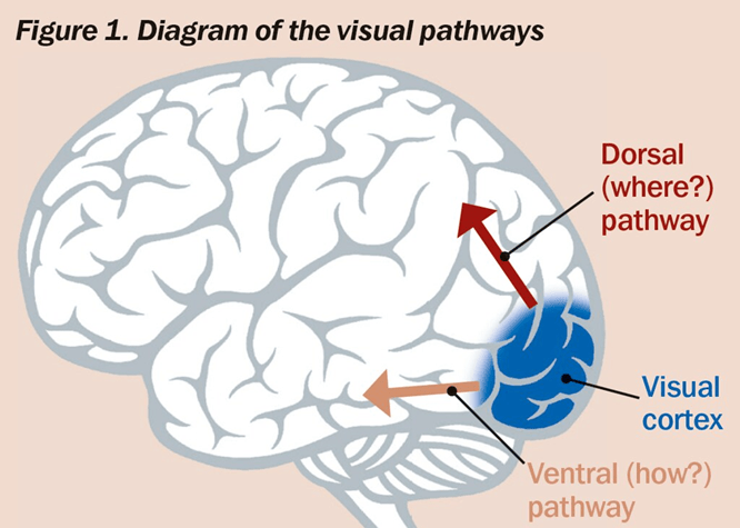 Because our environments are three-dimensional, it is easy to take for granted the complexity built into our visual systems for processing 3D stimuli. Part of this complexity arises from the interconnectedness of our visual processing system with other brain areas. For example, visual information is carried along a pathway which leads to the occipital lobe. The occipital lobe, in turn, has connections to other parts of the brain that support various mental functions, such as visual attention, object recognition, and spatial awareness. For example, the dorsal attention pathway helps guide eye movements and spatial attention, while the ventral pathway aids in identifying and interpreting visual objects (see Figure 1 below).