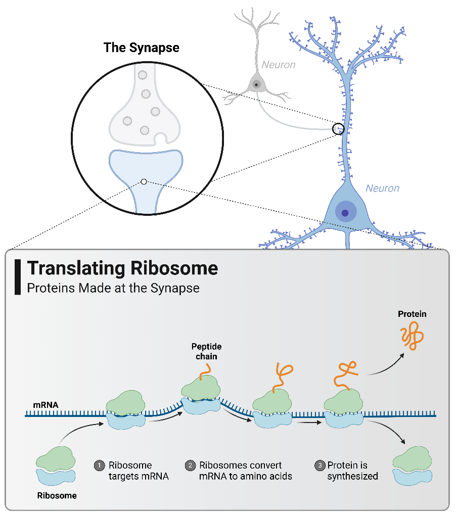 Flashback: You’re back in high school attentively listening to your biology teacher’s lesson on the different parts of the cell. Aside from the nucleus as the master control center and the mitochondria being coined as “the powerhouse of the cell”, you remember that ribosomes are responsible for creating new proteins from messenger RNAs (mRNA) through protein synthesis, formally known as “translation”. When we relay this concept of translation into the context of the brain, neuroscientists were initially under the impression that protein synthesis occurred only in the cell body of neurons, or the soma, and that these newly created proteins would then venture off into different parts of the neuron to perform their niche functions. Sounds straightforward, right? But what if I told you there’s more to the story of protein synthesis? Over decades of research, scientists began to question the long-held idea that protein synthesis happens only in the soma of neurons. A new idea emerged from this research showing that protein synthesis can also occur within neuronal processes – dendrites and axons – through a process called local protein synthesis.