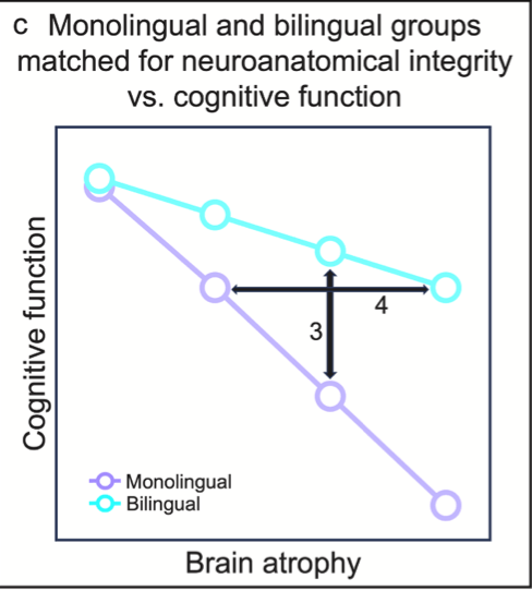 Studies of Alzheimer’s disease show that when multilingual and monolingual patients with similar symptoms are compared, multilinguals’ brain scans often show more extensive pathology (2). So, more damage is required for multilinguals to reach the same degenerative mental state.